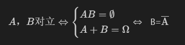 - A,B不能同时发生,且至少一个发生,称A,B对立